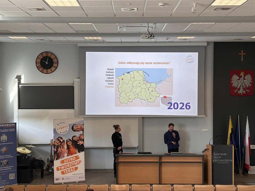 Całe wydarzenie, dzięki gościnności Centrum Nauk Technicznych w Chojnicach, odbyło się w tamtejszym audytorium. Na spotkanie zostali zaproszeni uczniowie samorządów uczniowskich szkół ponadpodstawowych naszego powiatu. Finalnie udział w nim wzięli uczniowie Technikum nr 3 w Chojnicach, Technikum nr 1 w Chojnicach, oraz I i II LO w Chojnicach.